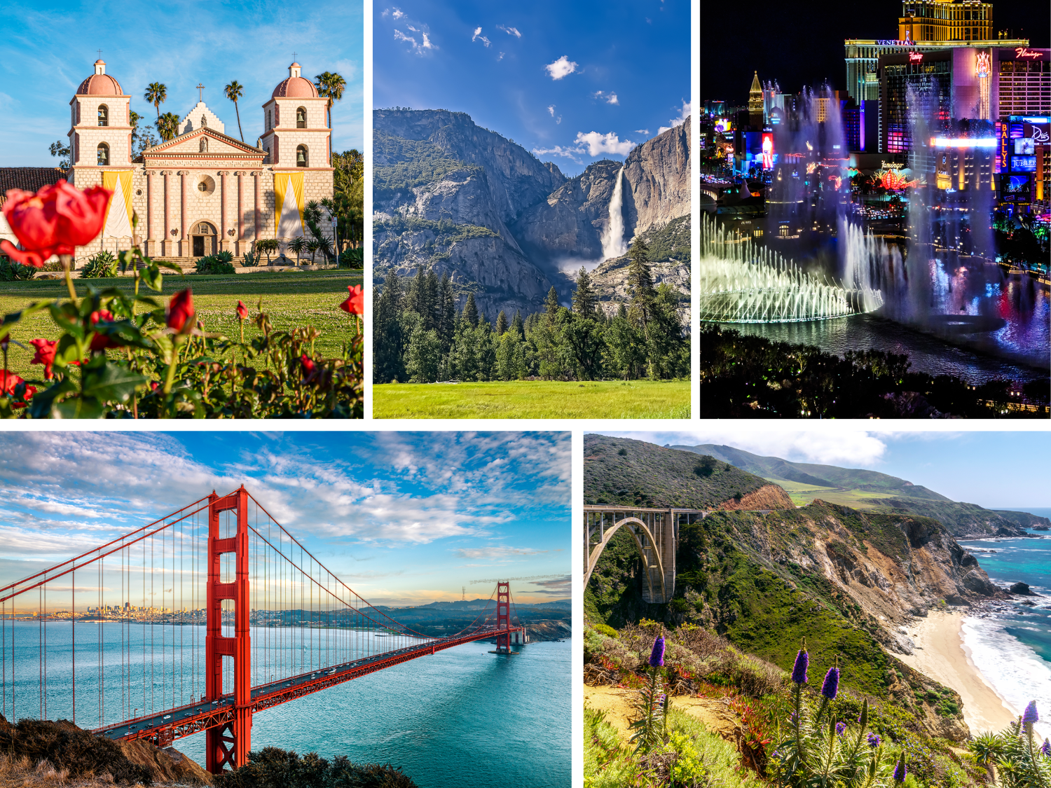 | 料金に含まれるサービス | ホテル宿泊費4泊分(税金・朝食込み(コンチネンタル)) / エアコン付きバスまたはバン、専門ツアーガイド / サンフランシスコベイクルーズとヨセミテ国立公園見学 / サンタバーバラ、カーメル、サンフランシスコ、ラスベガス「ストリップ」、フーバーダム観 光 | ||||||